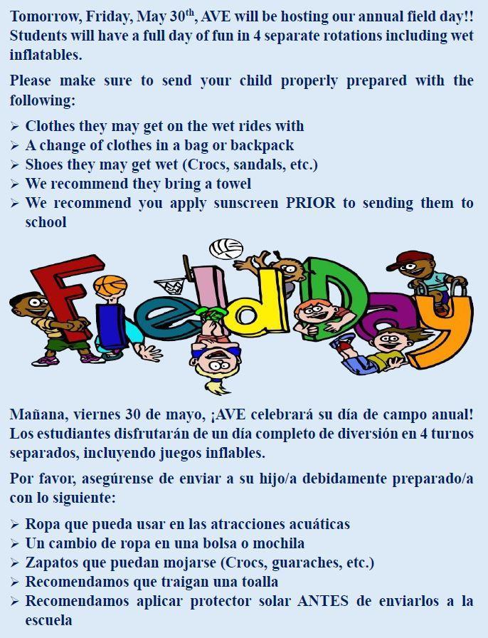 Tomorrow, Friday, May 30th, AVE will be hosting our annual field day!! Students will have a full day of fun in 4 separate rotations including wet inflatables.