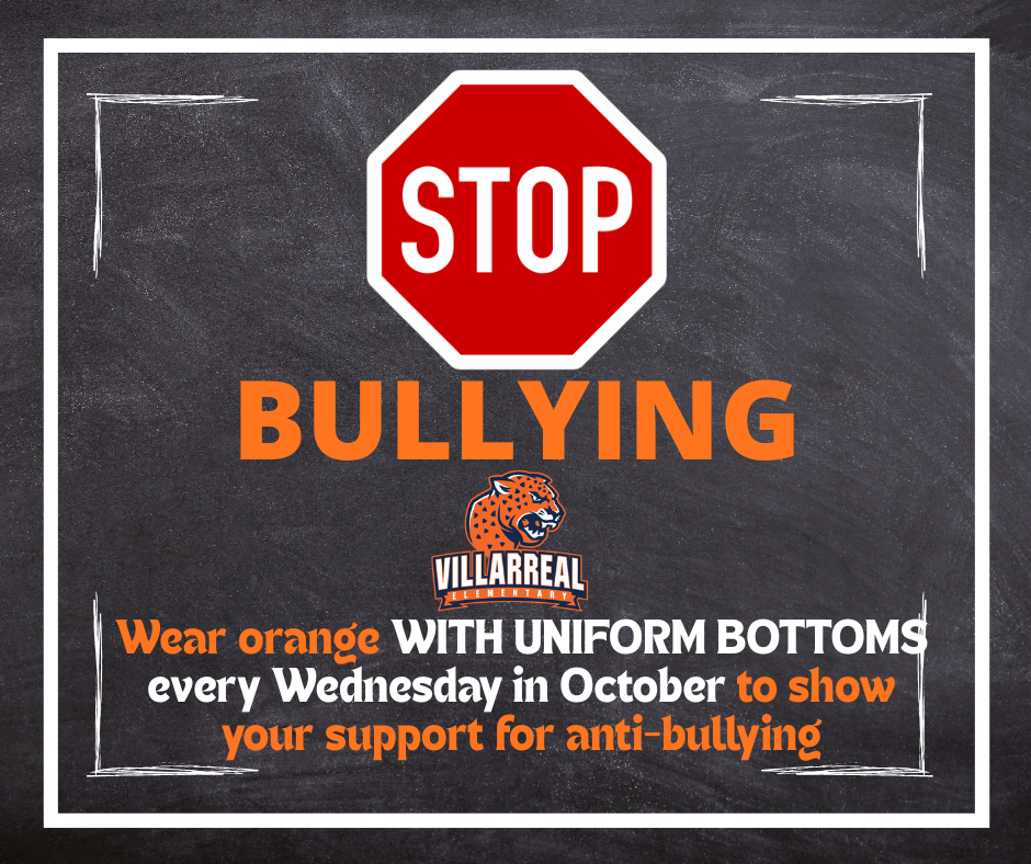 Wear orange WITH UNIFORM BOTTOMS every Wednesday in October to show your support for anti-bullying